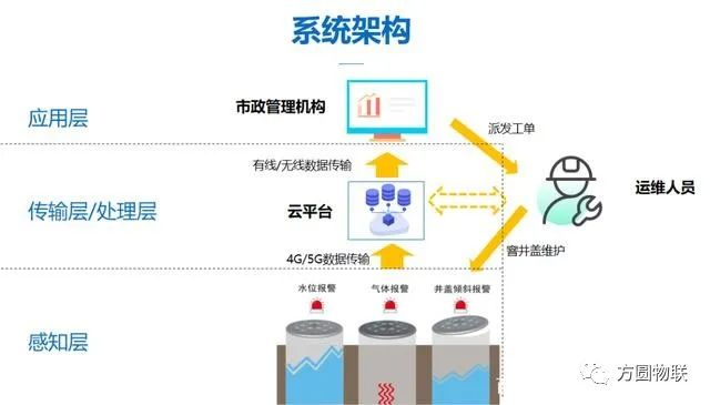 方圆智慧井盖监控平台基于“互联网+”和大数据技术,专门针对城市各类别窨井盖管理而搭建物联网系统解决方案,通过物联网监测窨井盖的倾斜、移位、破损、积水、燃气泄漏、震动等状态,并将实时信息即时传输至云平台,通知管理人员通过APP定位设施并快速检修,实现远程监测功能,防止信息滞后,同时降低人力巡检压力与成本,提高井盖的管理效率,达到远程管控、智能统计、智慧处理的管理目的。