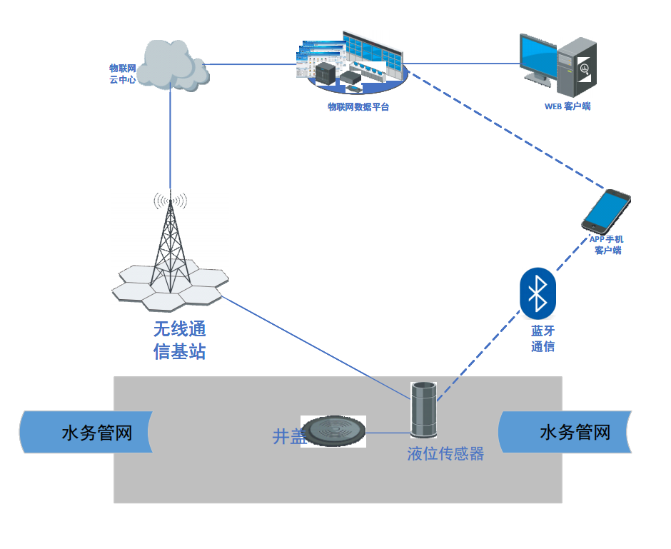 水位监测单元具备限位溢水监测功能,可根据设定范围值进行预设,当水溢到达限位后主动发生告警,告警信息通过主控单元上报至综合监测平台进行告警处理,该产品主要在市政、水务、生态园区等应用。